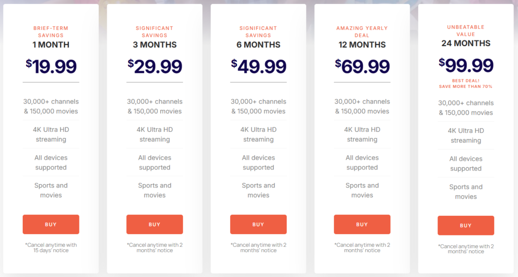 | 1 Month | $19.99 | 30K+ channels, 150K movies, 4K, all devices |