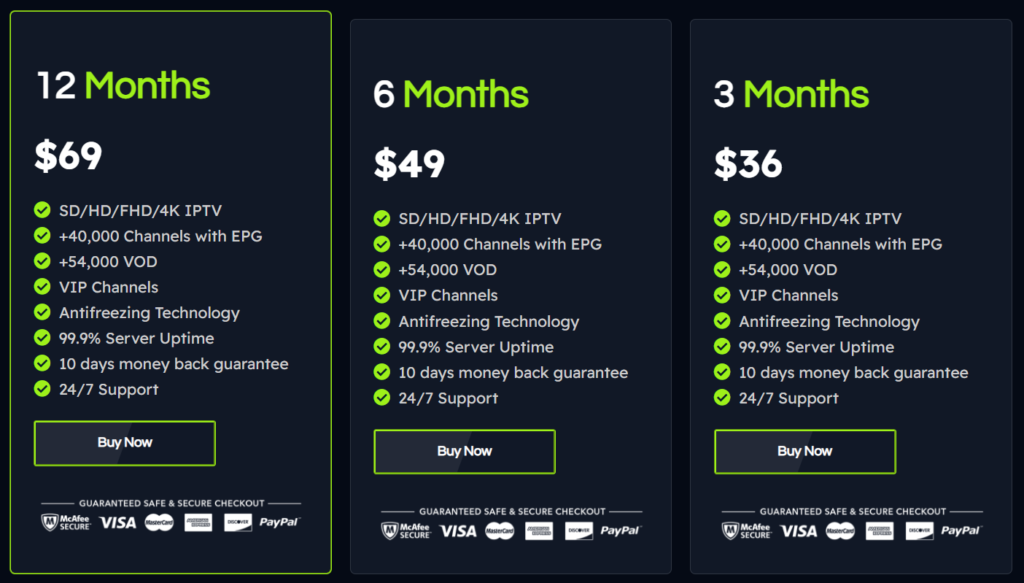 | 3 Months | $36 | 40K+ Channels, 54K+ VOD | SD–4K | EPG, VIP, Anti-freeze, 99.9% Uptime, 24/7 Support |