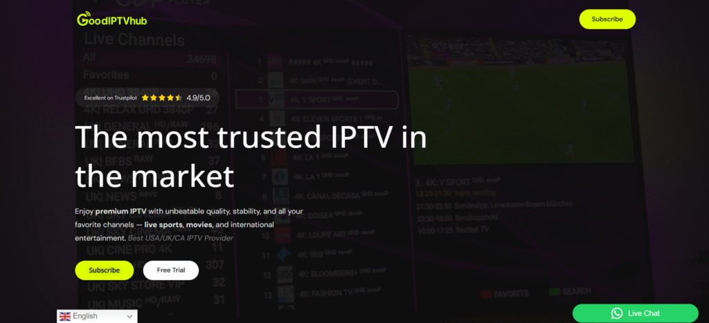 GoodIPTVHub is an IPTV-based provider which allows users to subscribe and instantly access up to several thousand live TV channels along with movies and content on demand and that too from multiple countries. Besides, it employs M3U playlists and compatible applications to function as an IPTV service. Different devices like Smart TVs, Android boxes, and Firesticks can be used by the users to watch sports, news, entertainment, and international content.