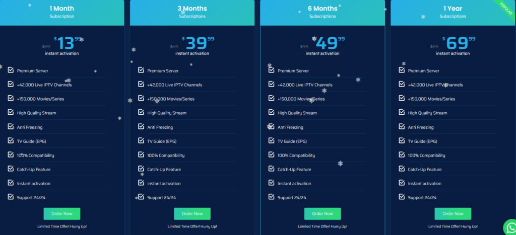 6 Months$49.99Stable servers, 42,000+ channels, 150,000+ movies/series, HD/4K, catch-up feature