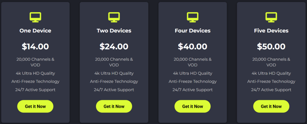 | 4 Devices | $40.00 | 20,000 Channels & VOD, 4K, Anti-Freeze, 24/7 Support |
