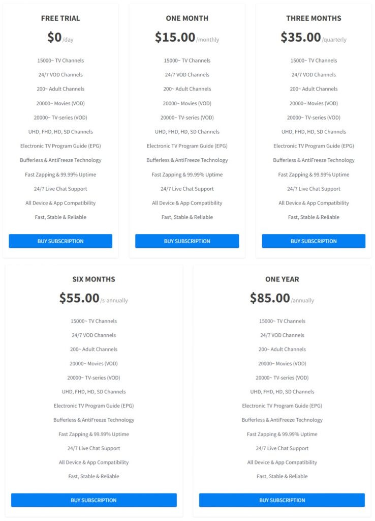 | 1 Year | $85 | 15,000+ | 24/7 | UHD/HD/SD | 24/7 Chat |